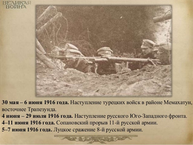 61. 61. 30 мая – 6 июня 1916 года. Наступление турецких войск в районе Мемахатун, восточнее Трапезунда. 4 июня – 29 июля 1916 года. Наступление русского Юго-Западного фронта. 4–11 июня 1916 года. Сопановский прорыв 11-й русской армии. 5–7 июня 1916 года. Луцкое сражение 8-й русской армии.