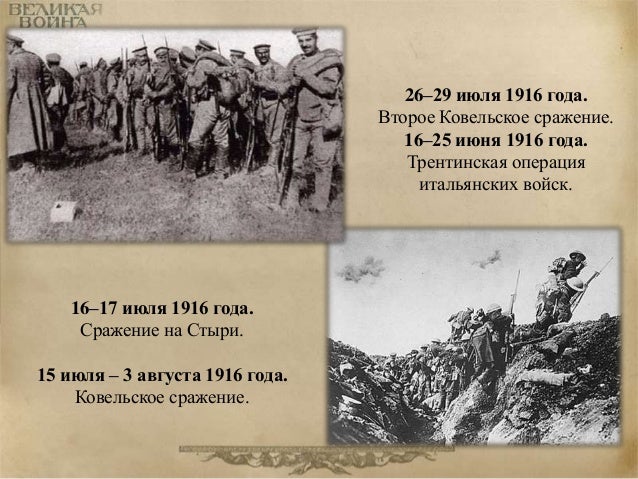 63. 63. 26–29 июля 1916 года. Второе Ковельское сражение. 16–25 июня 1916 года. Трентинская операция итальянских войск. 16–17 июля 1916 года. Сражение на Стыри. 15 июля – 3 августа 1916 года. Ковельское сражение.