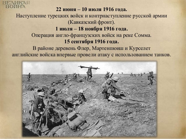 64. 64. 22 июня – 10 июля 1916 года. Наступление турецких войск и контрнаступление русской армии (Кавказский фронт). 1 июля – 18 ноября 1916 года. Операция англо-французских войск на реке Сомма. 15 сентября 1916 года. В районе деревень Флер, Мартенпюиш и Курселет английские войска впервые провели атаку с использованием танков.