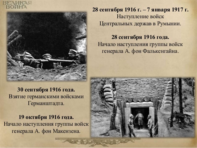 68. 68. 28 сентября 1916 г. – 7 января 1917 г. Наступление войск Центральных держав в Румынии. 28 сентября 1916 года. Начало наступления группы войск генерала А. фон Фалькенгайна. 30 сентября 1916 года. Взятие германскими войсками Германштадта. 19 октября 1916 года. Начало наступления группы войск генерала А. фон Макензена.