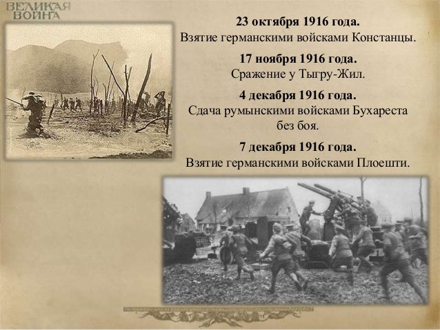 69. 69. 23 октября 1916 года. Взятие германскими войсками Констанцы. 17 ноября 1916 года. Сражение у Тыгру-Жил. 4 декабря 1916 года. Сдача румынскими войсками Бухареста без боя. 7 декабря 1916 года. Взятие германскими войсками Плоешти.