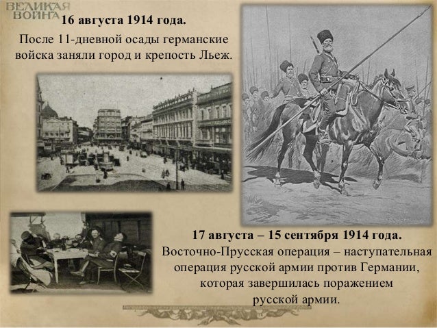 7. 7. 16 августа 1914 года. После 11-дневной осады германские войска заняли город и крепость Льеж. 17 августа – 15 сентября 1914 года. Восточно-Прусская операция – наступательная операция русской армии против Германии, которая завершилась поражением русской армии.