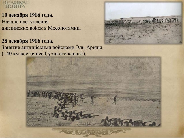 71. 71. 10 декабря 1916 года. Начало наступления английских войск в Месопотамии. 28 декабря 1916 года. Занятие английскими войсками Эль-Ариша (140 км восточнее Суэцкого канала).