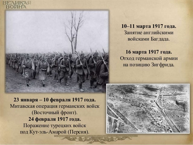 75. 75. 10–11 марта 1917 года. Занятие английскими войсками Багдада. 16 марта 1917 года. Отход германской армии на позицию Зигфрида. 23 января – 10 февраля 1917 года. Митавская операция германских войск (Восточный фронт). 24 февраля 1917 года. Поражение турецких войск под Кут-эль-Амарой (Персия).