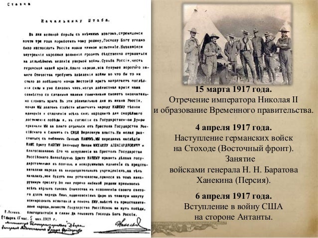 76. 76. 15 марта 1917 года. Отречение императора Николая II и образование Временного правительства. 4 апреля 1917 года. Наступление германских войск на Стоходе (Восточный фронт). Занятие войсками генерала Н. Н. Баратова Ханекина (Персия). 6 апреля 1917 года. Вступление в войну США на стороне Антанты.