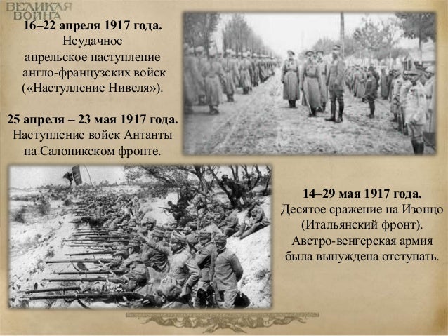 77. 77. 16–22 апреля 1917 года. Неудачное апрельское наступление англо-французских войск («Настулление Нивеля»). 25 апреля – 23 мая 1917 года. Наступление войск Антанты на Салоникском фронте. 14–29 мая 1917 года. Десятое сражение на Изонцо (Итальянский фронт). Австро-венгерская армия была вынуждена отступать.