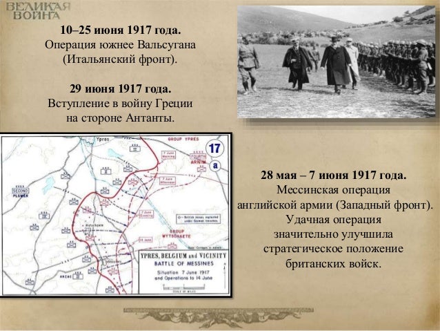 78. 78. 28 мая – 7 июня 1917 года. Мессинская операция английской армии (Западный фронт). Удачная операция значительно улучшила стратегическое положение британских войск. 10–25 июня 1917 года. Операция южнее Вальсугана (Итальянский фронт). 29 июня 1917 года. Вступление в войну Греции на стороне Антанты.
