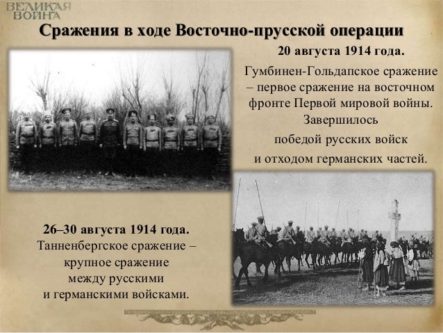 8. 8. Сражения в ходе Восточно-прусской операции 20 августа 1914 года. Гумбинен-Гольдапское сражение – первое сражение на восточном фронте Первой мировой войны. Завершилось победой русских войск и отходом германских частей. 26–30 августа 1914 года. Танненбергское сражение – крупное сражение между русскими и германскими войсками.
