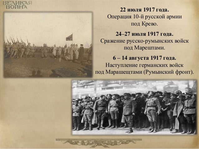 81. 81. 22 июля 1917 года. Операция 10-й русской армии под Крево. 24–27 июля 1917 года. Сражение русско-румынских войск под Марештами. 6 – 14 августа 1917 года. Наступление германских войск под Марашещтами (Румынский фронт).