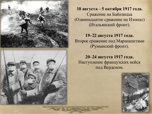 82. 82. 18 августа – 5 октября 1917 года. Сражение на Байнзицца (Одиннадцатое сражение на Изонцо) (Итальянский фронт). 19–22 августа 1917 года. Второе сражение под Марашештами (Румынский фронт). 20–24 августа 1917 года. Наступление французских войск под Верденом.