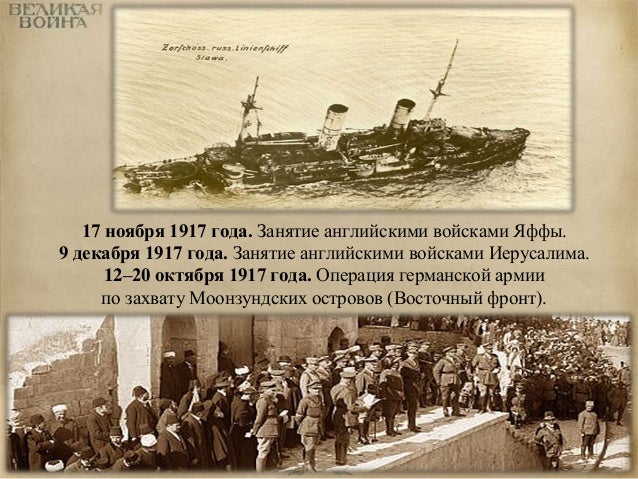 84. 84. 17 ноября 1917 года. Занятие английскими войсками Яффы. 9 декабря 1917 года. Занятие английскими войсками Иерусалима. 12–20 октября 1917 года. Операция германской армии по захвату Моонзундских островов (Восточный фронт).