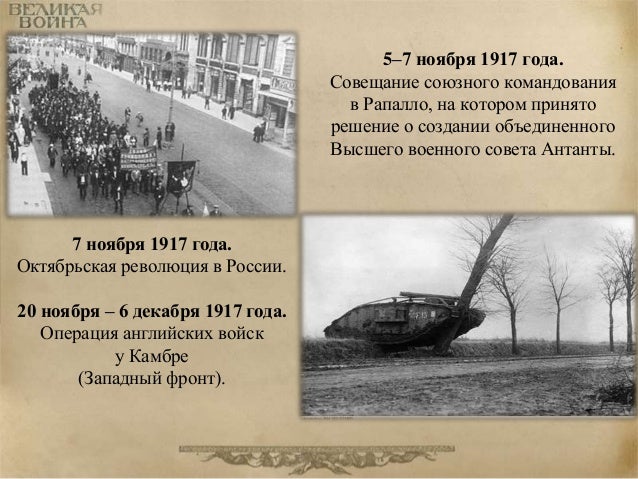86. 86. 5–7 ноября 1917 года. Совещание союзного командования в Рапалло, на котором принято решение о создании объединенного Высшего военного совета Антанты. 7 ноября 1917 года. Октябрьская революция в России. 20 ноября – 6 декабря 1917 года. Операция английских войск у Камбре (Западный фронт).