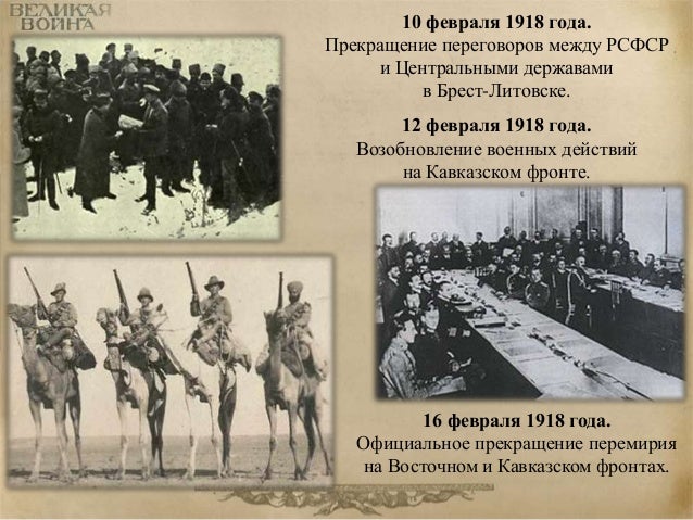 89. 89. 10 февраля 1918 года. Прекращение переговоров между РСФСР и Центральными державами в Брест-Литовске. 12 февраля 1918 года. Возобновление военных действий на Кавказском фронте. 16 февраля 1918 года. Официальное прекращение перемирия на Восточном и Кавказском фронтах.
