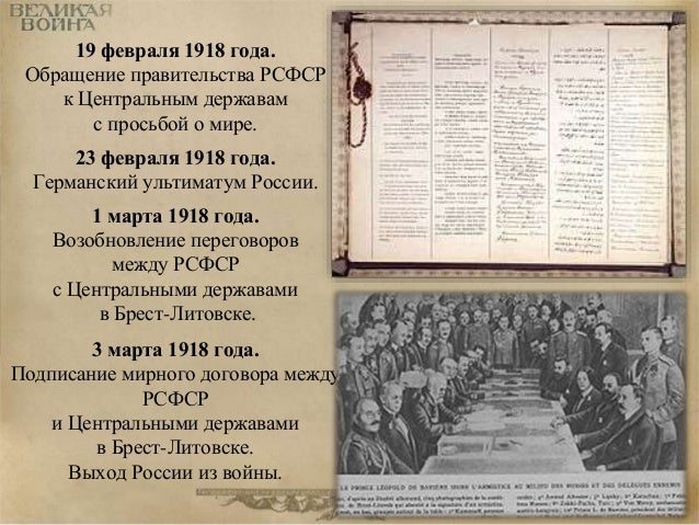 91. 91. 19 февраля 1918 года. Обращение правительства РСФСР к Центральным державам с просьбой о мире. 23 февраля 1918 года. Германский ультиматум России. 1 марта 1918 года. Возобновление переговоров между РСФСР с Центральными державами в Брест-Литовске. 3 марта 1918 года. Подписание мирного договора между РСФСР и Центральными державами в Брест-Литовске. Выход России из войны.