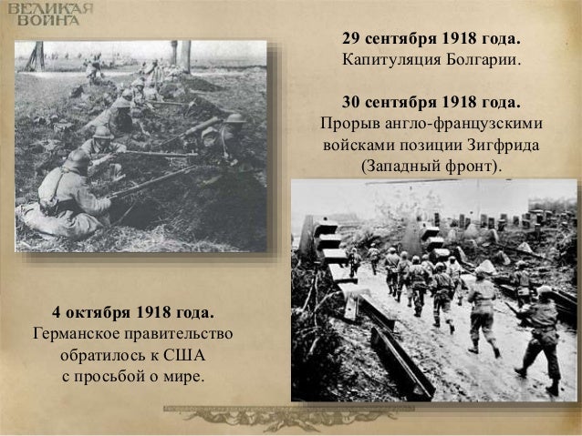 98. 98. 29 сентября 1918 года. Капитуляция Болгарии. 30 сентября 1918 года. Прорыв англо-французскими войсками позиции Зигфрида (Западный фронт). 4 октября 1918 года. Германское правительство обратилось к США с просьбой о мире.