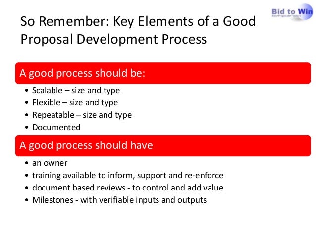 14. 14. So Remember: Key Elements of a GoodProposal Development ProcessA good process should be:• Scalable – size and type• Flexible – size and type• Repeatable – size and type• DocumentedA good process should have• an owner• training available to inform, support and re-enforce• document based reviews - to control and add value• Milestones - with verifiable inputs and outputs