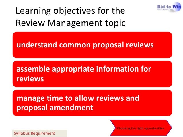15. 15. Learning objectives for theReview Management topic understand common proposal reviews assemble appropriate information for reviews manage time to allow reviews and proposal amendment Choosing the right opportunitiesSyllabus Requirement