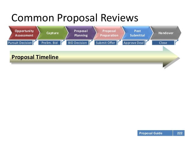 17. 17. Common Proposal Reviews Opportunity Proposal Proposal Post Capture Handover Assessment Planning Preparation SubmittalPursuit Decision Prelim. Bid BID Decision Submit Offer Approve Deal Close Proposal Timeline Proposal Guide 222