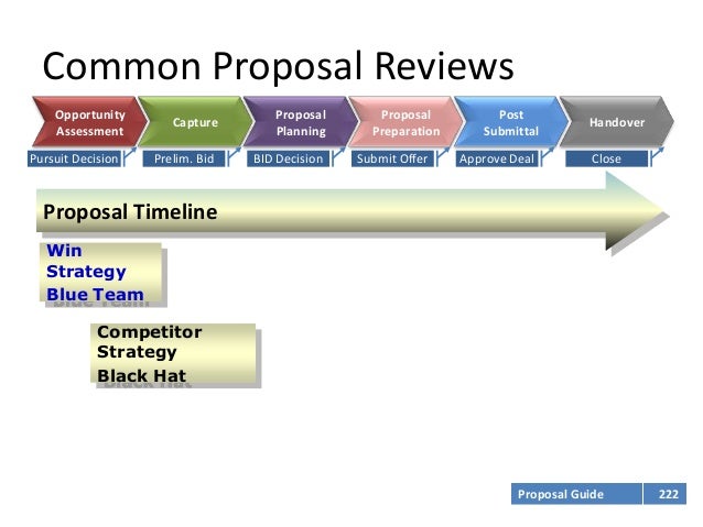 22. 22. Common Proposal Reviews Opportunity Proposal Proposal Post Capture Handover Assessment Planning Preparation SubmittalPursuit Decision Prelim. Bid BID Decision Submit Offer Approve Deal Close Proposal Timeline Win Proposal Strategy Final Strategy or Storyboard Document Blue Team Pink Team Red Team Competitor Business Strategy Case Black Hat Gold Team Proposal Guide 222
