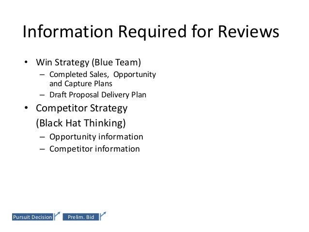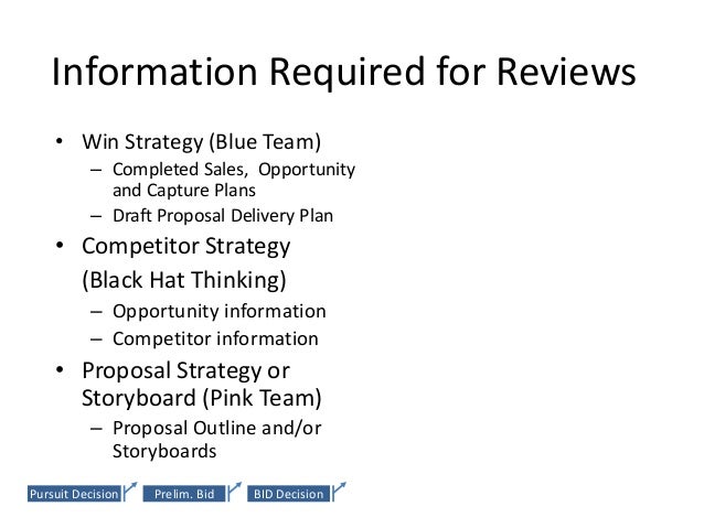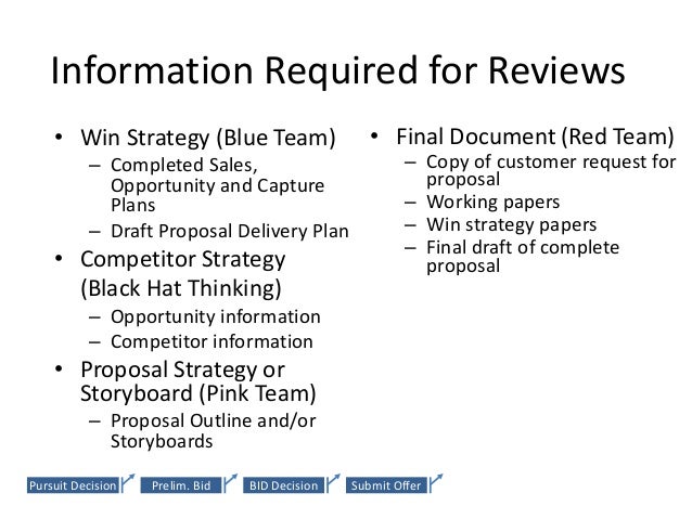 26. 26. Information Required for Reviews • Win Strategy (Blue Team) • Final Document (Red Team) – Completed Sales, Opportunity – Copy of customer request for and Capture Plans proposal – Draft Proposal Delivery Plan – Working papers • Competitor Strategy – Win strategy papers – Final draft of complete (Black Hat Thinking) proposal – Opportunity information • Business Case (Gold Team) – Competitor information – Internal approval forms • Proposal Strategy or • Lessons Learned Storyboard (Pink Team) (White Team) – Proposal Outline and/or – Internal feedback Storyboards – Customer feedbackPursuit Decision Prelim. Bid BID Decision