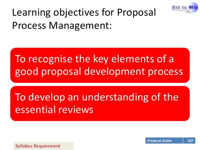 3. 3. Learning objectives for ProposalProcess Management:To recognise the key elements of agood proposal development processTo develop an understanding of theessential reviews Proposal Guide 187Syllabus Requirement