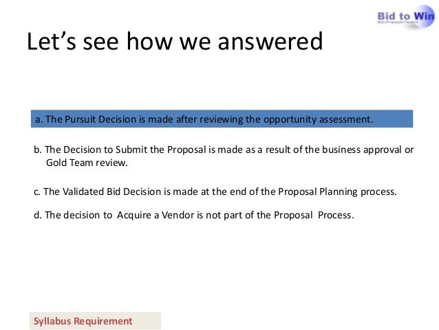 34. 34. Let’s see how we answereda. The Pursuit Decision is made after reviewing the opportunity assessment.b. The Decision to Submit the Proposal is made as a result of the business approval or Gold Team review.c. The Validated Bid Decision is made at the end of the Proposal Planning process.d. The decision to Acquire a Vendor is not part of the Proposal Process.Syllabus Requirement