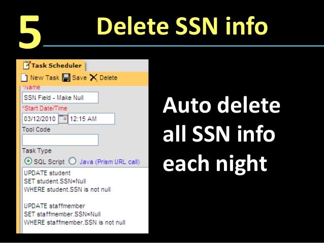 13. 13. Delete SSN info Auto delete all SSN info each night 5