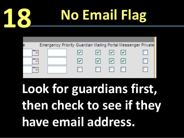 35. 35. No Email Flag 18 Look for guardians first, then check to see if they have email address.