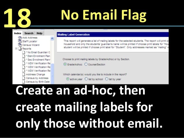 38. 38. No Email Flag 18 Create an ad-hoc, then create mailing labels for only those without email.