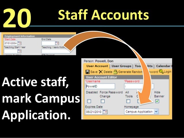 41. 41. Staff Accounts Active staff, mark Campus Application. 20