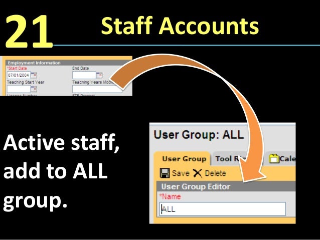42. 42. Staff Accounts Active staff, add to ALL group. 21