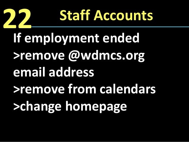 44. 44. Staff Accounts If employment ended >remove @wdmcs.org email address >remove from calendars >change homepage 22