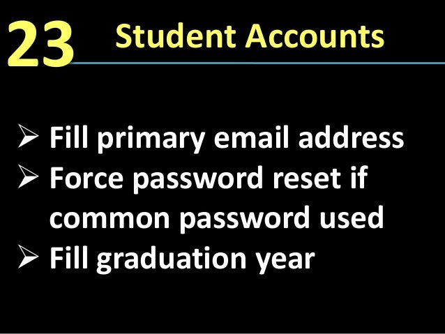 45. 45. Student Accounts  Fill primary email address  Force password reset if common password used  Fill graduation year 23