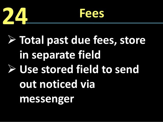47. 47. Fees 24  Total past due fees, store in separate field  Use stored field to send out noticed via messenger