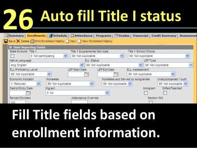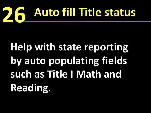 50. 50. Auto fill Title status Help with state reporting by auto populating fields such as Title I Math and Reading. 26