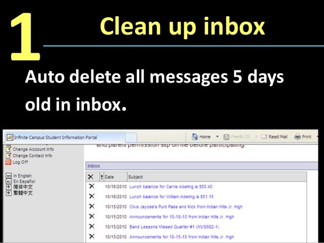 6. 6. Clean up inbox Auto delete all messages 5 days old in inbox. 1
