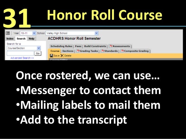 62. 62. Honor Roll Course 31 Once rostered, we can use… •Messenger to contact them •Mailing labels to mail them •Add to the transcript