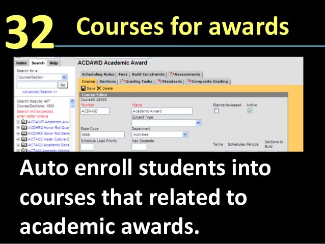 63. 63. Courses for awards Auto enroll students into courses that related to academic awards. 32