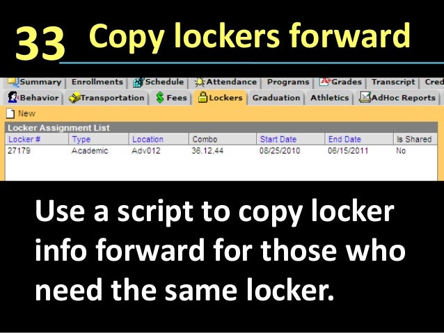 64. 64. Copy lockers forward Use a script to copy locker info forward for those who need the same locker. 33