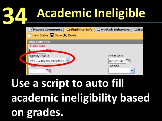 66. 66. Academic Ineligible Use a script to auto fill academic ineligibility based on grades. 34