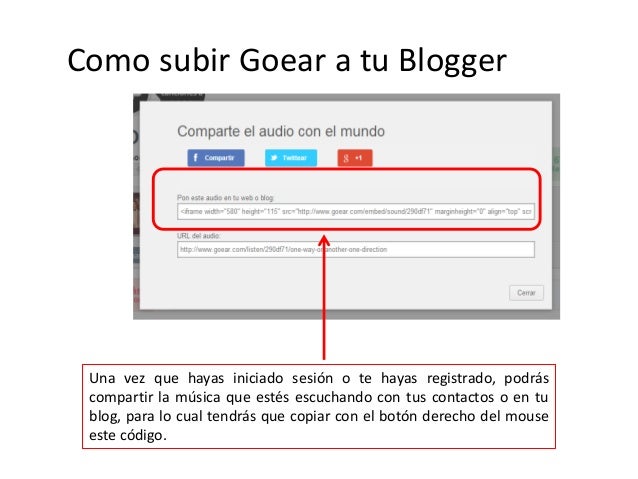 17. 17. Como subir Goear a tu Blogger Una vez que hayas iniciado sesión o te hayas registrado, podrás compartir la música que estés escuchando con tus contactos o en tu blog, para lo cual tendrás que copiar con el botón derecho del mouse este código.