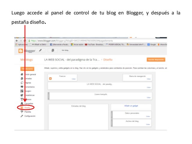 18. 18. Luego accede al panel de control de tu blog en Blogger, y después a la pestaña diseño.
