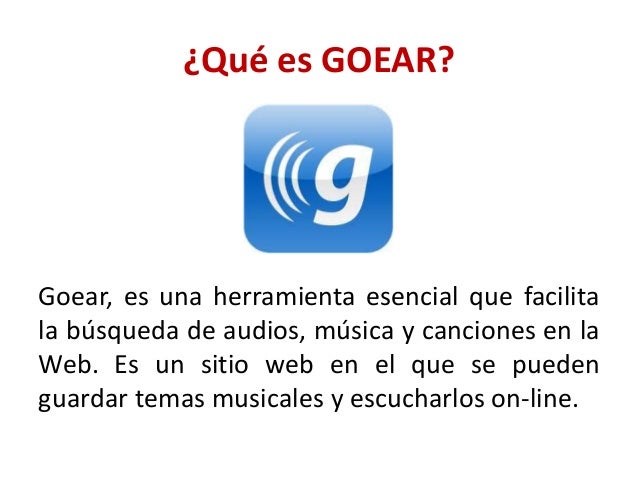 2. 2. ¿Qué es GOEAR? Goear, es una herramienta esencial que facilita la búsqueda de audios, música y canciones en la Web. Es un sitio web en el que se pueden guardar temas musicales y escucharlos on-line.