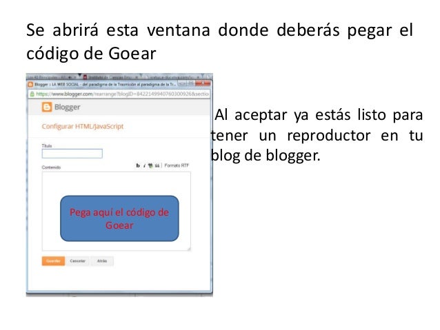 21. 21. Se abrirá esta ventana donde deberás pegar el código de Goear Al aceptar ya estás listo para tener un reproductor en tu blog de blogger. Pega aquí el código de Goear