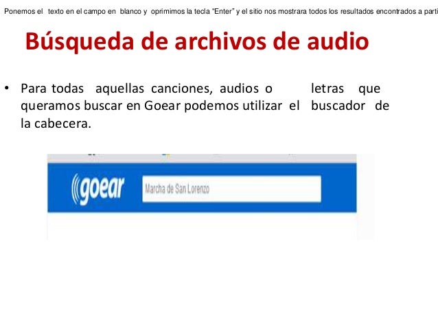 8. 8. Ponemos el texto en el campo en blanco y oprimimos la tecla “Enter” y el sitio nos mostrara todos los resultados encontrados a partir Búsqueda de archivos de audio • Para todas aquellas canciones, audios o letras que queramos buscar en Goear podemos utilizar el buscador de la cabecera.