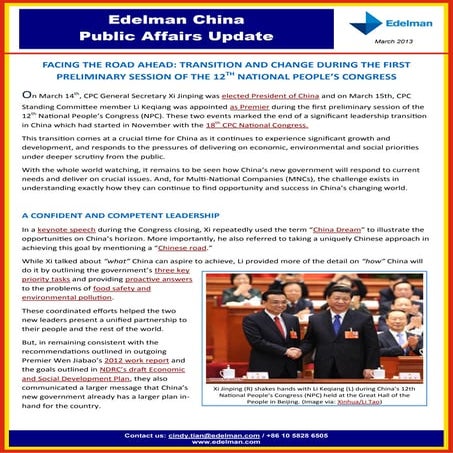 2. 2. 2 | 2014 | BRUNSWICK © Introduction On Thursday 13th March, China concluded the second session of the 12th National People’s Congress (“NPC”) a day after the Chinese People’s Political Consultative Congress (“CPPCC”) wrapped up its parallel session. The lianghui, as the two meetings are commonly known, are one of the most important annual events on the Chinese political calendar. This year’s lianghui marked the first year in office of Li Keqiang as Premier and provided important detail in how the government will implement the directives announced during November last year. The sessions presented few surprises and reinforced a commitment to deepen economic liberalisation and enhance the role of market forces with many of the details reaffirming the key principals detailed during the 3rd Plenary Session of the Central Committee of 18th Communist Party of China (“CCCPC”) last November. Reform – including increasing the role of market forces – was front and centre over the last two weeks. In Premier Li Keqiang’s first Government Work Report to the nation he mentioned “reform” a record 77 times in his nearly two hour report – compared to just 55 times in last year’s GovernmentWork Report delivered by the former premier,Wen Jiabao. The leadership team has recognised that the growth model that has driven the country over the last 35 years is not sustainable and is causing significant challenges. Li Keqiang outlined reforms that will increase the role of market forces and adjust the role of government. Multiple sectors were called out by Li and others at the meetings for specific reforms – from finance to healthcare – while also calling on national resolve to tackle environmental challenges. Li noted that “environmental pollution has become a major problem,which is nature’s red-light warning against the model of inefficient and blind development” and stated to delegates that “we must have the mettle to fight on and break mental shackles to deepen reforms on all fronts”. As Premier Li noted, reform and opening-up are closely interconnected. Combined they will bring a range of positive opportunities for investors. The commitment to allow market forces to play an increasingly decisive role in China is positive for business as it will introduce greater predictability. Yet, even with reform and opening-up as central pillars rought corporate success in China will not guarantee continued success through this current administration. Some of the considerations that we discuss later in this report include: ■■ The battle against officials’ misconduct has expanded firmly into the corporate environment. It is imperative that companies operating in China ensure their corporate compliance systems are robust and are matched to the scale of their expanding China business. ■■ The expectations on companies operating in China have evolved and they are being held to a higher standard than they were in the past. Companies must ensure that they are operating in China consistently with their global values and are genuinely responsible local citizens. ■■ Some sectors will remain challenging, regardless of the positive reform agenda. For companies operating in those sectors it will require concerted issue engagement and resolve. ■■ The authorities are working to change the economic growth model and companies that operate in areas that were previously prioritised must consider how they can adjust to meet the new long-term focus. ■■ A number of government bodies are looking to make their mark with decisive judgements, such as those involved in anti-trust. Brunswick’s Public Affairs team in China have compiled an overview of the key takeaways from this year’s lianghui, the implications for business and what it may mean for China’s future policy direction. Analysis of previous political meetings is available at www.brunswickgroup.com/publications/reports.
