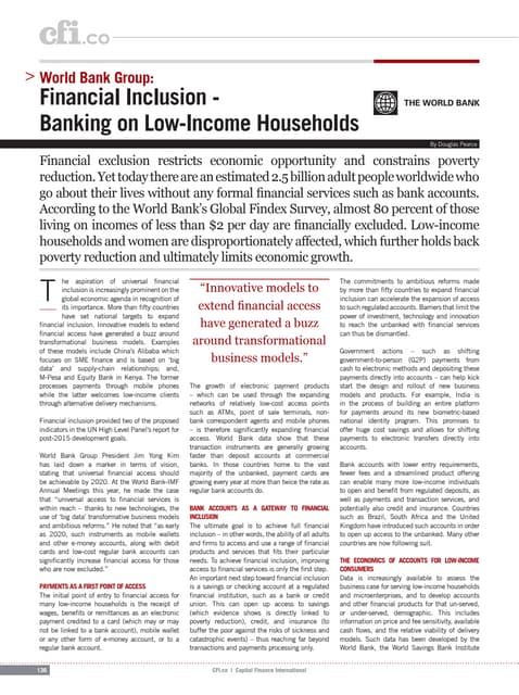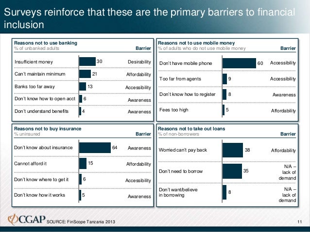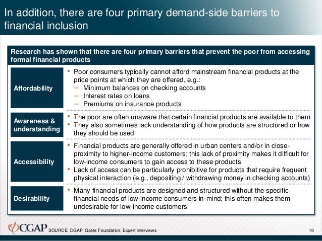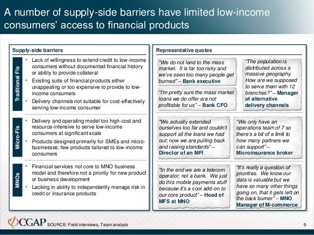 In developing economies, low-income consumers do not have access to many financial products due to both a) suppliers’ lack of will and capability to develop products and business models appropriate to serving the bottom of the pyramid and b) a number of demand-side barriers involving price, consumer awareness, and product accessibility