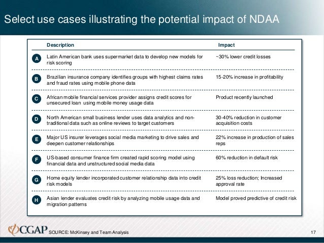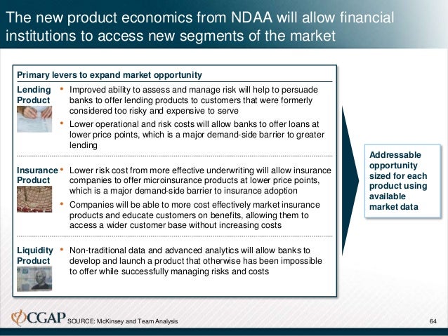 Our analysis suggests that NDAA could lower delivery costs by 15% to 30% for lending and insurance products, and facilitate the development of a low-cost credit line tied to a mobile wallet: