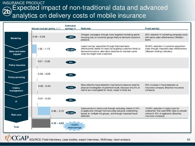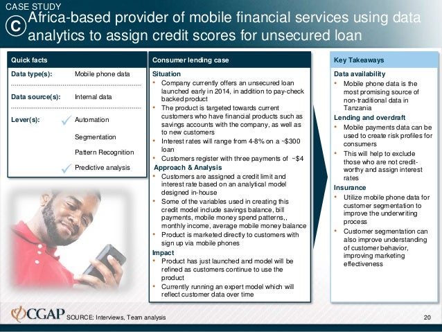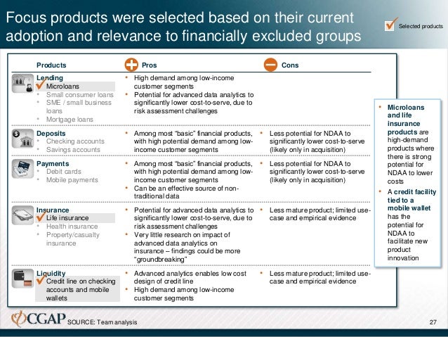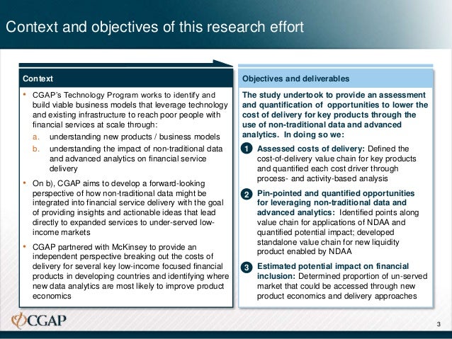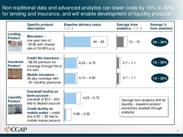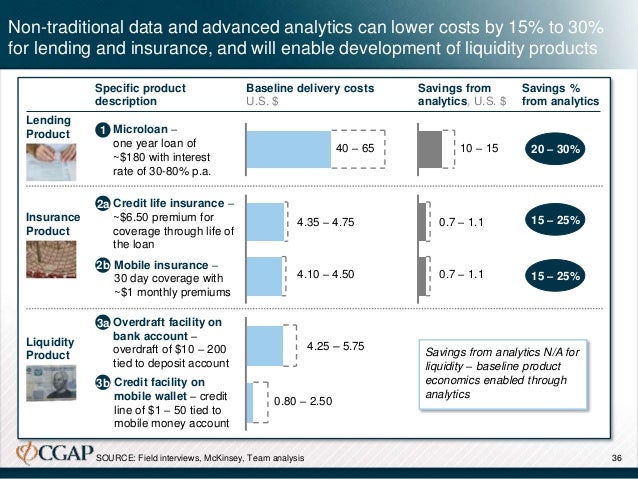 In order to assess the impact of leveraging non-traditional data and advanced analytics, we examined the way in which these applications might lower the cost structures of two financial products: microloans and microinsurance. We additionally assessed the potential for these applications to facilitate the development of new types of liquidity products tied to transactions accounts