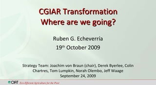1. CGIAR Transformation Where are we going? Ruben G. Echeverría 19 th October 2009 Eco-Efficient Agriculture for the Poor Strategy Team: Joachim von Braun (chair), Derek Byerlee, Colin Chartres, Tom Lumpkin, Norah Olembo, Jeff Waage September 24, 2009
